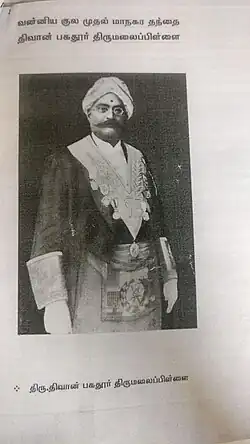 Dewan Bahadur V. Thirumalai Pillai was an Indian politician from Vanniyar Community and Served as the President of the Madras Corporation from 1923 to 1924. He was a member of the Justice Party. Pillai also served as trustee of Pachaiyappa Charities and a member of the committee of management of Chengalvaraya Naicker's Technical Institute, one of the pioneer institutions in the city of Madras of promoting technical education. He along with Sir P.Theagaraya Chetti took great plans to reorganize the institute according to modern requirement.[1]