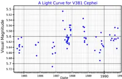 The star was discovered to be a variable star in 1991, by Elaine M. Halbedel.[14] It was given its variable star designation, V381 Cephei, in 1995.[15]