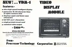 The Processor Technology VDM-1, for Video Display Module, was the first video card for S-100 bus computers.[1] It was created in 1975 and allows an S-100 machine to produce its own display. When paired with a keyboard and Processor Technology's 3P+S card, it eliminates the need for a separate video terminal. Using a 7 x 9 dot matrix and ASCII characters, it produces a 64-column by 16-row text display.