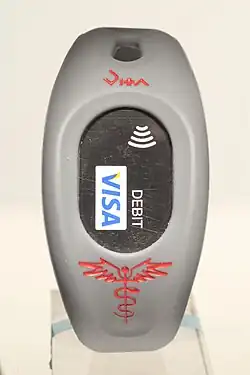 The designers wanted to set their product apart from others so they integrated contactless payment technology into the band.[8] A user has to set up his Emergency Response Profile (ERP), which includes basic contact information, blood type, allergies, insurance information, medications, and emergency contacts.[8][9] Annual subscription is required to maintain the Emergency Response Profile (ERP)[1] In the case of an emergency, medical professionals are trained to look for the number on the user's VITAband and then would have instant access to their ERP.[10] It's a simple bracelet that is keyed to a remote website that holds vital information, such as name, address, and any medical conditions a user might have.[11] The system accepts insurance information.[4][11] An integrated Visa debit card with payWave wireless functionality has been used.[5] Via this technology, the user makes a payment by waving the chip in front of a credit card terminal. To use the contactless payment via VITAband which is a prepaid card, the user must first set up a VITAband Visa prepaid card.[4][12] Users can load the card with anywhere from US$25 to $500 via the company website.[9]