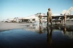 On 1 February 1966, The squadron was again redesignated as Marine All Weather Fighter Squadron 333 (VMF(AW)-333) when they received new all-weather versions of the F-8 Crusader. The squadrons last name change came on 20 June 1966 when they became Marine Fighter Attack Squadron 333 (VMFA-333) as they transitioned to the F-4 Phantom II. On 5 June 1972, VMFA-333 departed Naval Air Station Oceana for a six month deployment on board the USS America (CVA-66). The America arrived at Yankee Station off the coast of South Vietnam on 13 July 1972 and VMFA-333 began flying combat sorties the next day.[2] It was during this deployment that the squadron got its only air-to-air kill when Major Lee T Lasseter, USMC along with his RIO, Capt. John D. Cummings shot down a MiG-21 over North Vietnam, near Hanoi. After the shoot down both aircraft were damaged by flak and an SA-2 SAM, which hit 5526 in the tail section. Close to running out of fuel and with 5526 on fire from the SAM hit, the pilots ejected just south of Haiphong Harbor. The incident was also the first and only all-Marine kill during the Vietnam War. Two other Marines shot down MiGs but they were on exchange with the Air Force.[3] Until 1978 the squadron remained affiliated with Carrier Air Wing 8 and made a 1976 deployment aboard the USS Nimitz (CVN-68). Major Lee T. Lasseter later assumed command of VMFA-333 and was named Marine Aviator of the year for 1972.