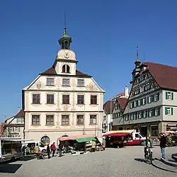 A fire destroyed the old town hall building in 1693. It was rebuilt in the same location in 1720, following long years of controversy between the citizens of Vaihingen and the administration of Württemberg. Its paintings date back to 1901. The ground floor was originally used as a sales area for tradesmen.