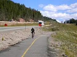 A bike path parallels I-70 from Vail Colorado to the Copper Mountain Ski Area and is the only pass in Colorado with a paved bike path on both sides for the entire distance.[8] This 8.7 mile climb from East Vail with an 1,831 foot (558m) vertical gain and descent to Copper is a popular activity for cyclists during the summer and fall.[9] This route leads to several other bike paths in Summit County.[8] During the winter months the area hosts backcountry skiing and snowmobile activities.