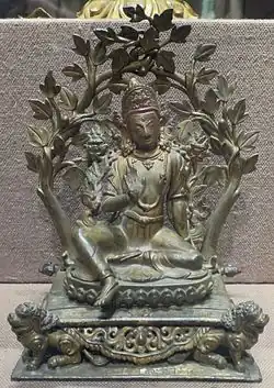 Vajrapāni is also called Chana Dorji and Chador and extensively represented in Buddhist iconography as one of the earliest three protective deities or bodhisattvas surrounding the Buddha. Each of them symbolizes one of the Buddha's virtues: Manjushri manifests all the Buddhas' wisdom, Avalokiteśvara manifests all the Buddhas' immense compassion, and Vajrapāni protects Buddha and manifests all the Buddhas' power[1] as well as the power of all five tathāgatas (Buddhahood of the rank of Buddha).[2]