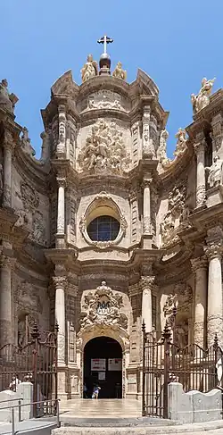 During the Baroque period, the German Konrad Rudolf designed in 1703 the main door of the cathedral, known as the Iron gate due to the cast-iron fence that surrounds it. Because of the War of the Spanish Succession he could not finish it, and this task fell mainly to the sculptors Francisco Vergara and Ignacio Vergara. Its concave shape, which causes a unique and studied perspective effect, was distorted during the 20th century because of the demolition of some adjacent buildings (in what was formerly Saragossa Street) to expand the square (Plaza de la Reina).