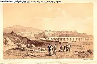 The approximately 500m long overflow dam over the Karun, Iran's most effluent river, was the core structure of the Shushtar Historical Hydraulic System (سازههای آبی شوشتر) from which the city derived its agricultural productivity.[5] The arched superstructure carried across the important road between Pasargadae and the Sasanian capital Ctesiphon.[6] Repaired repeatedly throughout the Islamic era,[7] the dam bridge remained in use until the late 19th century.[8] In 2009, it was designated by UNESCO as Iran's 10th World Heritage Site.[9]