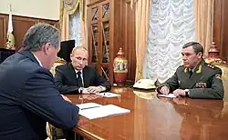 Gerasimov was involved in the planning of the 2022 Russian invasion of Ukraine.[31][32] The sources say the decision to invade Ukraine was made by Vladimir Putin and a small group of war hawks around him, including Gerasimov, Russia's Defence Minister Sergei Shoigu and Putin's national security adviser Nikolai Patrushev.[33] During the invasion, The Moscow Times considered Gerasimov to have disappeared from public view since around 12 March 2022, when he talked with the Chief of the Turkish General Staff, and 4 March, when he talked with French Chief of the Defence Staff Thierry Burkhard. Other senior siloviki (key Russian security officials), including Sergei Shoigu, Igor Kostyukov and Alexander Bortnikov, disappeared around the same time.[34]