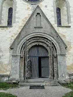 In 1343 the church was damaged during the St. George's Night Uprising. Restoration works and other additions to the church henceforth were more clearly Gothic in form. For example, the windows, the vaults of the upper parts of the building, and the blind arch decoration on the west façade are typically pointed. The builders during this time possible came from Varnhem Abbey in Sweden. The church was clearly built to be able to function as a refuge in times of troubles, as well as a church. There are rooms above the vaults that are constructed so that they could only be reached using a ladder which could be pulled up. Also, an internal passageway just under the windows on the inside of the walls could be utilised to repel an advancing enemy.[1][2]