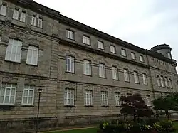 The project by the architects Joaquín Rojí López-Calvo and José de Lorite Kramer was selected in July 1904, as stated in the minutes of the school. The work was put out to tender at a cost of 575,109.20 pesetas. The building consisted of two courtyards, chapel, library and laboratories.[5] The work was promoted by the Minister Augusto González Besada (a former student of the high school). On 5 January 1905, the two architects who designed the building project arrived from Madrid to start work on the Provincial General and Technical High School of Pontevedra and met with the mayor Bernardo López Suárez and the contractor,[6] Manuel Domínguez.[7] On 4 May, the architects returned to the city and the ground plan was drawn up on the site to begin work.[8] In February 1906, the construction of the building got underway,[9] and by April, numerous workers were already working on it,[10][11][12] with the material being transported by means of carts.[13]
