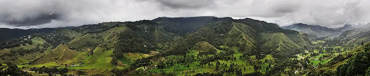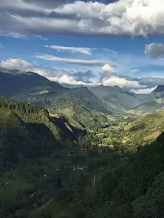 The Cocora Valley (Spanish: Valle de Cocora) is a valley in the Quindío Department of Colombia. It is located in the Central Cordillera of the Andean mountains. "Cocora" was the name of a Quimbayan princess, daughter of the local chief Acaime, and means "star of water" (Spanish: estrella de agua).