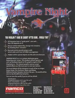 Vampire Night (ヴァンパイアナイト, Vanpaia Naito) is a 2000 light-gun shooter video game developed by Wow Entertainment and published by Namco for arcades. It is a collaboration between Sega and Namco. It was later ported to PlayStation 2 in November 2001. The gameplay itself utilizes the engine that is used in The House of the Dead series.