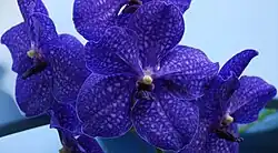 Vanda, abbreviated in the horticultural trade as V.,[3] is a genus in the orchid family, Orchidaceae. There are 90 species,[2] and the genus is commonly cultivated for the marketplace. This genus and its allies are considered to be among the most specifically adapted of all orchids within the Orchidaceae. The genus is highly prized in horticulture for its showy, fragrant, long-lasting, and intensely colorful flowers.[4] Vanda species are widespread across East Asia, Southeast Asia, and New Guinea, with a few species extending into Queensland and some of the islands of the western Pacific.[2][5]