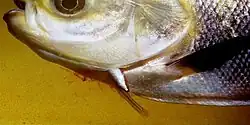 Vandellia cirrhosa is a small, freshwater catfish. Members of the genus Vandellia can reach up to 17 cm (7 in) in standard length,[5] but some others can grow to around 40 cm (16 in). The fish has an elongated body with an anterior dorsal fin and pelvic fin, and an anal fin slightly larger than the dorsal fin. The caudal fin is fairly small with a truncated shape. Each has a rather small head and a belly that can appear distended, especially after a large blood meal. The body is translucent, making it quite difficult to spot in the turbid waters of its home. Blood is often visible through the translucent body after feeding.[6] The fish has small eyes with yellow irises.[7] There are short sensory barbels around the head, together with short, backward pointing spines on the gill covers.[8] These spines have been described as popping out in an umbrella-like fashion, which could be used to help lodge the fish into its host.[7]
