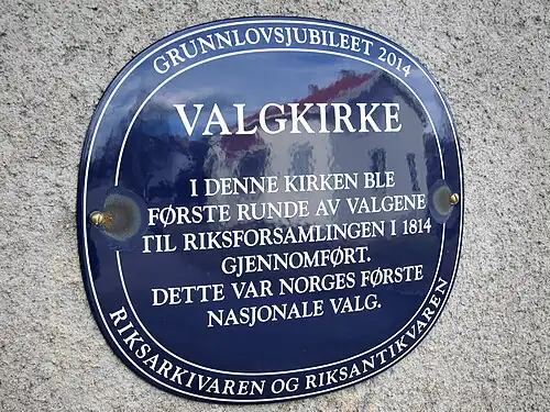 In 1814, this church served as an election church (Norwegian: valgkirke).[5][6] Together with more than 300 other parish churches across Norway, it was a polling station for elections to the 1814 Norwegian Constituent Assembly which wrote the Constitution of Norway. This was Norway's first national elections. Each church parish was a constituency that elected people called "electors" who later met together in each county to elect the representatives for the assembly that was to meet at Eidsvoll Manor later that year.[5][7]