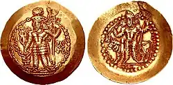 ) which had been in use since Vasudeva I,[6] suggesting that the Kidarites had now taken control, first under their ruler Kirada.[8] Ram horns were added to the effigy of Varahran on his coinage for a brief period under the Kidarite ruler Peroz, and raised ribbons were added around the crown ball under the Kidarite ruler Kidara.[9][8] In effect, Varahran has been described as a "puppet" of the Kidarites.[10]