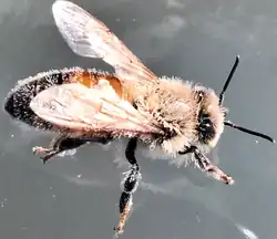 Varroa destructor, the Varroa mite, is an external parasitic mite that attacks and feeds on honey bees and is one of the most damaging honey bee pests in the world.[2][3] A significant mite infestation leads to the death of a honey bee colony, usually in the late autumn through early spring. Without management for Varroa mite, honey bee colonies typically collapse within 2 to 3 years in temperate climates.[4] These mites can infest Apis mellifera, the western honey bee, and Apis cerana, the Asian honey bee. Since it is very similar physically to the closely related Varroa jacobsoni, these species were thought to be one prior to 2000, but they were found to be two separate species by DNA analysis.