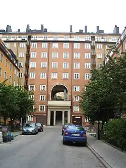 The buildings facing the surrounding blocks are traditional 5–6 floors residential buildings forming a wall around Röda Bergen. From the monumental eastern entrance, an avenue (Rödabergsgatan) leads west to a round elevated space where a church was originally planned. Perpendicular to this avenue, the heavily trafficked Torsgatan cuts through the area. The blocks within Röda Bergen are limited to 2–3 floors and most of the backyards are open in one end, which allows for plenty of sun light and series of spaces appealing to the eye. Hallman's design was a sharp break with the contemporary narrow, dark, and often filthy backyards. In contrast to them, the involved architects — including Björn Hedwall, Paul Hedqvist, and Sven Wallander — carefully detailed the façades and gables facing the interior with simple classical ornaments and warm red and yellow colours. Of the 2.500 flats in the area, many included novelties such as warm and cold water, WC, and even bath tubes, but most of them were small — half of them was a single room with a kitchen or even less.[3]