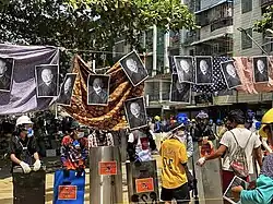 He became one of the main targets of the protesters and was singled out for criticism at anti-regime protests, with some protesters attaching photos of him to htamein (women's sarongs) and hanging them in public places to express their wrath. Seeing the pictures of the monk he venerates attached to htamein, Min Aung Hlaing ordered his troops to take the women's garments down and publicly announced in his state-run newspapers that anyone committing the act would be charged with insulting Buddhism.[5][8]