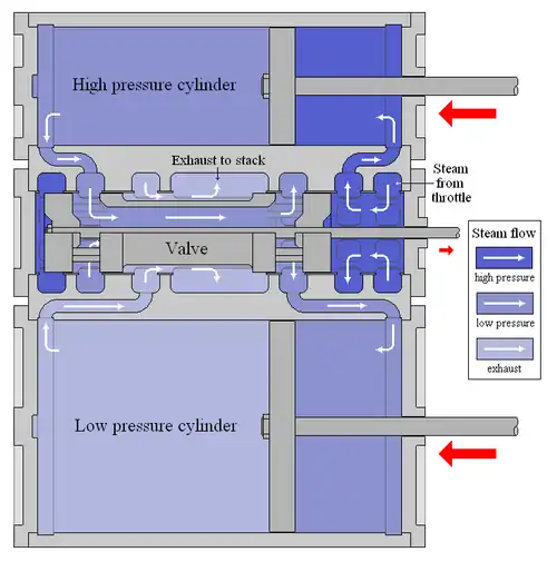 The high- and low-pressure cylinders were mounted in vertical line with each other, with the piston rods in parallel. Usually the low-pressure cylinder was on the bottom, but clearance issues sometimes caused it to be put on the top. In the former case, the valve cylinder was mounted directly inboard from the high-pressure cylinder; in the latter case, the valves were also placed inboard, but at a level between the two power cylinders.[5] The placement of the valves necessitated an inside-connected valve gear, and the Stephenson pattern was used (being the dominant type of the era anyway). One extra appliance required was a starting valve, manually controlled, which allowed admission of high-pressure boiler steam directly to the low-pressure intake. Without this, the low-pressure cylinders would have to actually work against atmospheric pressure.[6]