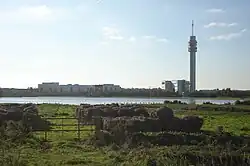 The lake measures 450 by 400 metres. The southern shore is formed by a constructed wetland used for water purification. Large numbers of waterfowl may be found here and along the swampy eastern shore during the winter season (e.g. greylag geese, wigeons, common goldeneyes).[1] The local angling club has released carps into the lake.[2] A sandy beach measuring some 300 m was created at the western shore. An area sufficiently shallow to accommodate safe swimming by inexperienced bathers is cordoned off. Furthermore, a grassy sunbathing area sporting a public toilet adjoins the lake, as well as a children's adventure playground. The lake is only a short walking distance from Haarlem Spaarnwoude railway station and relatively close to the A200 and A9 motorways. This favourable location has helped to make it a popular area for organising mid to large-scale events. Thus, 2006 saw the Circus Herman Renz pitch its tent alongside the lake.