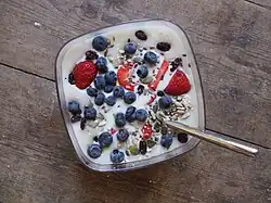 Butter and margarine can be replaced with alternate vegan products.[126] Vegan cheeses are made from seeds, such as sesame and sunflower; nuts, such as cashew,[127] pine nut, and almond;[128] and soybeans, coconut oil, nutritional yeast, tapioca,[129] and rice, among other ingredients; and can replicate the meltability of dairy cheese.[130] Nutritional yeast is a common substitute for the taste of cheese in vegan recipes.[126] Cheese substitutes can be made at home, including from nuts, such as cashews.[127] Yoghurt and cream products can be replaced with plant-derived products such as soy yoghurt.[131][132]