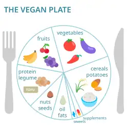 Vegan diets are based on grains and other seeds, legumes (particularly beans), fruits, vegetables, edible mushrooms, and nuts.[116] The main difference between a vegan and vegetarian diet is that vegans exclude dairy products, eggs, and honey.[117]