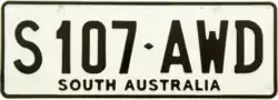 | South Australia | Black/white | Snnn·Taa | SOUTH AUSTRALIA | S000·TMK | Legend embossed at bottom. Letter Q not used and reserved for government vehicles; all 25 other letters used. |