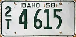 | 1958 | Embossed dark green serial on white plate with border line; "IDAHO 58" centered at top | "FAMOUS POTATOES" centered at bottom | A 12345 0/A 12345 | Coded by county of issuance (A or 0/A) | ||