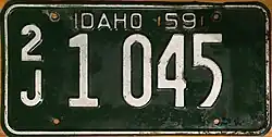 | 1959 | Embossed white serial on dark green plate with border line; "IDAHO 59" centered at top | "FAMOUS POTATOES" centered at bottom | A 12345 0/A 12345 | Coded by county of issuance (A or 0/A) | ||