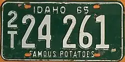 | 1968–70 | Embossed green serial on white plate with border line; "IDAHO 68" centered at top | "FAMOUS POTATOES" centered at bottom | A 12345 0/A 12345 1/A A1234 | Coded by county of issuance (A or 0/A) | |