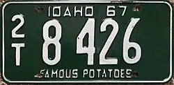 | 1967 | As 1959 base, but with "IDAHO 67" at top | "FAMOUS POTATOES" as on 1959 base | A 12345 0/A 12345 | Coded by county of issuance (A or 0/A) |