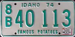 | 1974 | Embossed green serial on white plate with border line; "IDAHO 74" centered at top | "FAMOUS POTATOES" centered at bottom | A 12345 K A1234 0/A 12345 0/A A1234 1/A AB123 | Coded by county of issuance (A or 0/A) | |