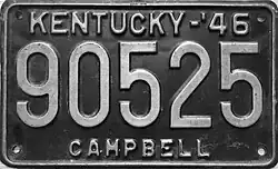 | 1946–47 | Embossed silver serial on black plate with border line; "KENTUCKY-'46" and county name centered at top and bottom respectively | none | 123-456 | Issued in blocks by county | Revalidated for 1947 with windshield stickers. | |