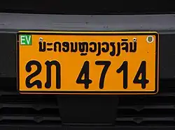 Vehicle registration plates of Laos were first introduced in 1950. The current version started in 2001. The background and text colour vary by type of vehicle. Ordinary plates use black on orange.[1]