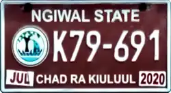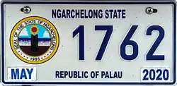 | 2020 (?) | Yellow serial on blue background; "Ngeremlengui State" and "Republic of Palau" in white at top and bottom respectively | Ngeremlengui | |||