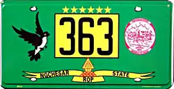 | 2019 | Black numbers on white background all centered in a black bordered box; green plate background with stars at top and banner at bottom | Ngchesar | |||