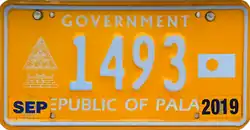 | 2019 | White numbers on orange background; bai (men's meeting house) left, flag right | White "GOVERNMENT" above serial number | 1234 | Republic of Palau | |