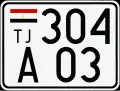 The plate design is black characters on a white background; the sign is a square two-row. In the top row, the state flag of the Republic of Tajikistan is applied, under which the car code “TJ” is written, followed by three digits; in the bottom row there is a letter and two numbers of the region of registration.