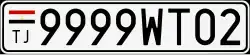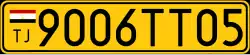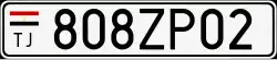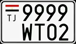 The plate design is black characters on a white background. On the left, the state flag of the Republic of Tajikistan is applied, under which the car code “TJ” is written, followed by four digits, two smaller letters and two digits indicating the region of registration. A two-row license plate has also been developed, where four numbers are placed in the top row, and letters and the region code in the bottom row, however it has only been issued on trailers. Since 2014, the size of letters and numbers is the same.
