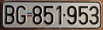 Car number plates in SFR Yugoslavia consisted of a two-letter district code that showed the place where the car carrying them was registered, followed by a red star and two groups of digits that could contain two or three characters, for example: BG 12-34, BG 123-45 or BG 123-456. The letter codes matched the municipalities of Yugoslavia:[1]