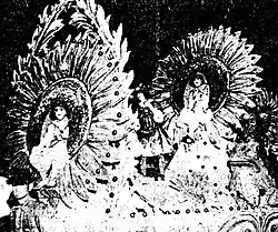 The Veiled Prophet selected the Queen from among the young women who had been invited as candidates. Beginning in 1894, those not selected were retained as Maids of Honor. A number of married women were known as Ladies of Honor, to act as chaperones.[92] In that year, residents of the wealthy West End, St. Louis, were treated to the appearance of[93]