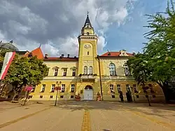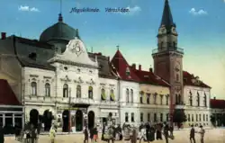 In 1893, Kikinda was declared a royal free city.[15] At the end of the 19th century Kikinda was the most densely inhabited place in Torontál County, with 22,000 inhabitants.[20] After the declaration of a free city, period from the end of the 19th century to the beginning of the World War I was a peaceful and fruitful one in the history of Kikinda and was marked by a strong economic and urban development of the city.[15] Moreover, the core of the city was formed, and the city received a defined local government in 1895 (statute, senate, town representative, mayor (Karlo Radovan), etc.). According to the 1910 census, the population of Kikinda numbered 26,795 inhabitants, of whom 14,214 (53.00%) spoke Serbian, 5,968 (22.27%) Hungarian, and 5,855 (21.85%) German.[21]