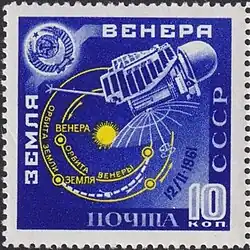 Venera 1 (Russian: Венера-1 meaning Venus 1), also known as Venera-1VA No.2 and occasionally in the West as Sputnik 8, was the first spacecraft to perform an interplanetary flight and the first to fly past Venus, as part of the Soviet Union's Venera programme.[1] Launched in February 1961, it was intended as an impactor, but flew past Venus on 19 May of the same year; however, radio contact with the probe was lost before the flyby, resulting in it returning no data.