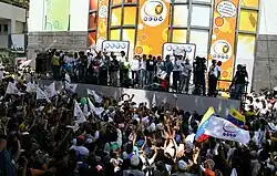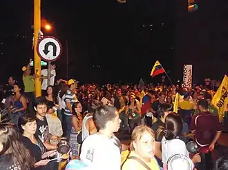 On 28 December 2006, Chávez informed that he would not renew Radio Caracas Televisión's (RCTV) concession, which was due to expire on 27 May 2007, and therefore the signal had to stop programming on that day. The government argued that the refusal to renew was due to the position taken by RCTV during the 2002 coup d'état.[116] RCTV's directors declared that the channel's concession did not expire until 2021, calling the measure an abuse by the government, and demonstrations in support of the channel took place.[117] Supreme Tribunal of Justice rejected an appeal that argued that the license revocation was illegal. On 19 May, over 30,000 people gathered in Caracas to protest the decision, while there were also marches in Maracaibo, Puerto La Cruz, Valencia and other main cities in the country. A march in favor of the freedom of expression was organized on 21 May in Caracas, led by students and journalists.[118][119] The Supreme Tribunal later reaffirmed Chávez's decision that RCTV had to end its transmissions by 27 May.[120]