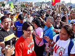 The then leader of the opposition party, Manuel Rosales, said that it was an insult to call for another election because "the collectivity is overwhelmed by so many problems and also by the high cost of living and inflation" and also because the proposal had already been rejected a year ago.[152] After the official announcement, other opposition parties such as Acción Democrática (AD), Primero Justicia (PJ), Copei, Podemos and MAS, rejected the proposal as well.[153] Leaders of Radical Cause rejected the intention of reelection, considering it unconstitutional, although they also expressed that the best way to defeat it would be through the vote and demonstrations.[154] On 6 December 2008, they announced the formation of the "National Command for the No", but some of the opposition leaders such as Omar Barboza and Julio Borges, from UNT and PJ, respectively, indicated that they would try legal actions for considering the constitutional amendment initiative as unconstitutional and antidemocratic.[155][156]