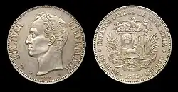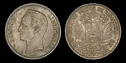 In 1879,[1] the Latin Monetary Union bimetallic standard was adopted, with the silver venezolano (venezolano de plata or fuerte) of 25g .900 fine and a gold venezolano of 1.612 g .900 fine. The subsidiary silver coinage was only .835 fine, legal tender to a maximum of 40 venezolanos per transaction.