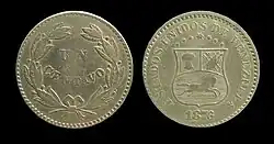 Given the inability of previous governments to order enough coins from the mints in Paris, London, and United States to meet demand, many foreign and demonetised coins circulated that were prone to perforations, scratches, chipping, or smoothing beyond recognition.[1] The monetary law of 11 May 1871 replaced the peso (the only one of the coins in circulation that was legal tender) with the venezolano at par. Coins were minted by several banks including la Compañía de Crédito (lit. The Credit Company) and Estado de Guayana (lit. State of Guiana) following a pattern of copper, nickel, silver and gold.