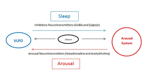 The sleep-promoting effects of the VLPO neurons is thought to be due to release of GABA and possibly galanin that suppresses firing of arousal system neurons. As the VLPO is also inhibited by neurotransmitters released by components of the arousal systems, such as acetylcholine and norepinephrine,[9] a current theory has proposed that the VLPO and the arousal system form a "flip-flop" circuit.[1][2] This term from electrical engineering denotes a circuit in which mutual inhibition means that each component of the circuit, as it turns on, turns the other off, resulting in rapid transitions from one state (wake or sleep) to the other, with minimal time in transition states. This theory has been used to create mathematical models that explain much of the wake-sleep behavior in animals, including in pathological states and responses to drugs.[1][24][25] Orexin neurons in the posterior lateral hypothalamus potentiate neurons in the ascending arousal system and help stabilize the brain in the waking state (and consolidated wakefulness, which builds up homeostatic sleep drive, helps stabilize the brain during later sleep). The loss of orexin neurons in the disorder narcolepsy destabilizes the wake-sleep switch, resulting in overwhelming sleep episodes during the waking day, as well as more frequent awakenings from sleep at night.[1]