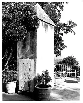 In 1872, a team of astronomers from Brazil began planning an expedition to Saint Thomas to observe the upcoming 1882 transit of Venus, when the planet would pass in front of the Sun. The observatory spot was chosen on a hill on the Estate Mafolie due to its elevation, rising above the city of Charlotte Amalie and allowing an uninterrupted view of the sky. Astronomers that took part in the expedition included Antonio Luis von Hoonholtz, Francisco Calhejros da Graca, and Arthur Indio do Brasil. The results of this expedition were published by the Imperial Observatory of Rio de Janeiro in 1887. During World War I, the hill was used as a gun mount, although no trace of this remains today. Later, an obelisk was constructed to commemorate the site's scientific significance. It is 13.5 feet (4.1 m) tall and built of masonry. The marble tablet that was used as an instrument station during the transit is now used as a plaque, written in Portuguese.[2] For its notability and contribution to the field of astronomy, the site was listed on the National Register of Historic Places in 1978.[1]