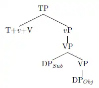 V1 word order can also be analyzed as a derivation from the more common SVO order through verbal phrase movement. This solution is commonly proposed for Austronesian languages.[1] Accounts on phrasal movement differ on 1) the highest maximal projection that moves (VP, vP, or TP), 2) the landing site of the moved phrase (Spec-TP or higher), and 3) the motivation for movement (generally agreed to be the EPP).